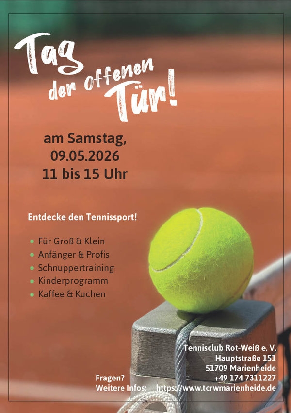 Wir, der Tennisclub Rot-Weiß Marienheide, laden am Samstag, 9. Mai, herzlich zum Tag der offenen Tür ein.